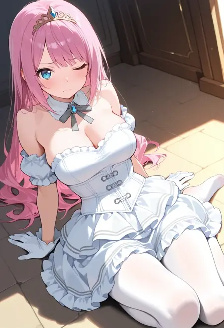 hair down,alternate hairstyle,tiara,detached collar,grey neck ribbon,white dress,white corset,strapless dress,detached sleeves,puffy short sleeves,white gloves,frilled dress,white frills,white pantyhose,