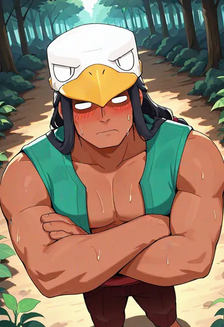 Bo, BrawlStars, male, brown skin, long hair, ponytail, long brown ribbon around his waist, brown pants, barefoot, green vest, white eagle-shaped cap, white eyes, shadow of the cap over his eyes