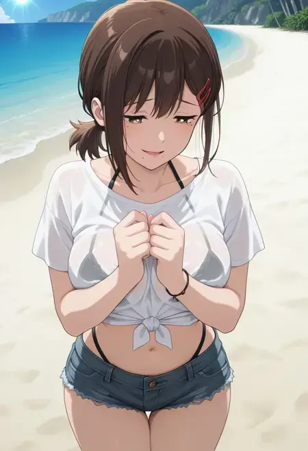 KobeniSlingshot2, 1girl, solo, brown hair, short hair, short ponytail, single sidelock, brown eyes, lips, hair ornament, hairclip, mole under mouth, mole under eye, multiple moles, collarbone, large breasts, white shirt, short sleeves, tied shirt, see thru shirt, bra slingshot under shirt, curvy, navel, highleg panty straps, denim shorts, jewelry, thighs, halterneck, bracelet, highleg, barefoot,
