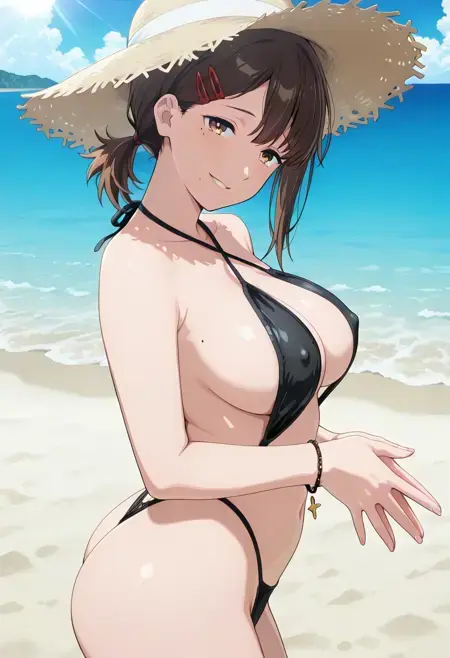 KobeniSlingshot, 1girl, solo, brown hair, short hair, short ponytail, single sidelock, brown eyes, lips, hair ornament, hairclip, mole under mouth, mole under eye, multiple moles, collarbone, large breasts, curvy, navel, black slingshot swimsuit, jewelry, thighs, criss-cross halter, halterneck, bracelet, highleg, barefoot,