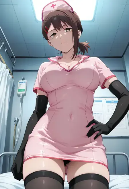 KobeniNurse, 1girl, solo, brown hair, short hair, short ponytail, single sidelock, brown eyes, lips, hair ornament, hairclip, mole under mouth, mole under eye, multiple moles, collarbone, large breasts, curvy, navel, nurse, pink nurse cap, black elbow gloves, pink miniskirt dress, cleavage cutout, black garters, black thighhighs, red shoes, high heels,