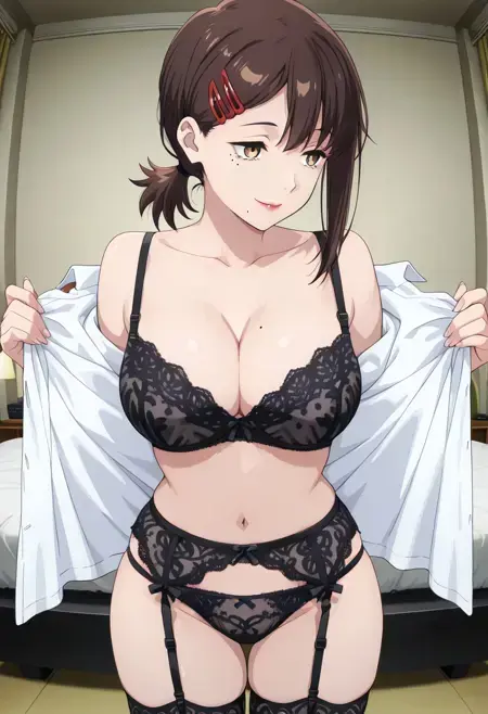 KobeniLingerie, 1girl, solo, brown hair, short hair, short ponytail, single sidelock, brown eyes, lips, hair ornament, hairclip, mole under mouth, mole under eye, multiple moles, collarbone, large breasts, curvy, navel, lingerie, red lips, black lace bra, cleavage, lace trim, black lace panties, black thighhighs, black garter belt, black garters, white shirt, open clothes, undressing, barefoot,