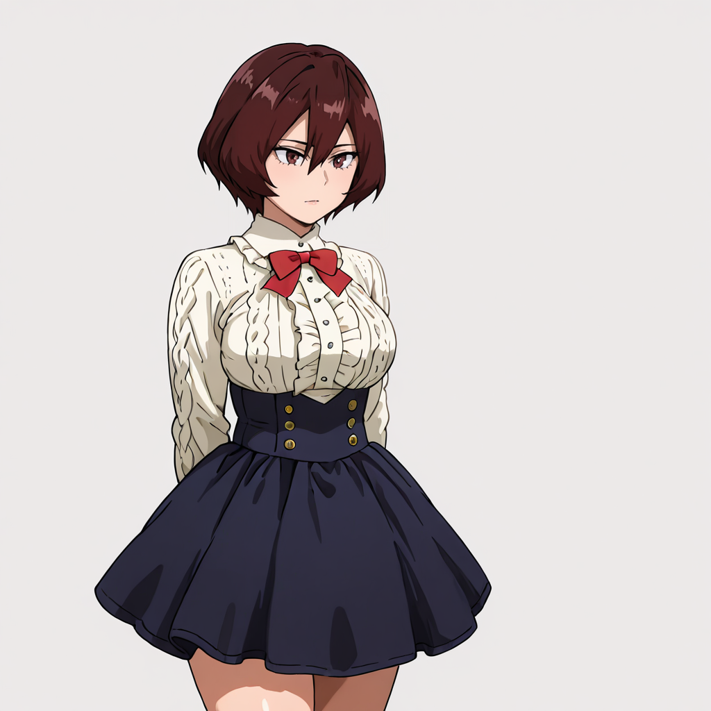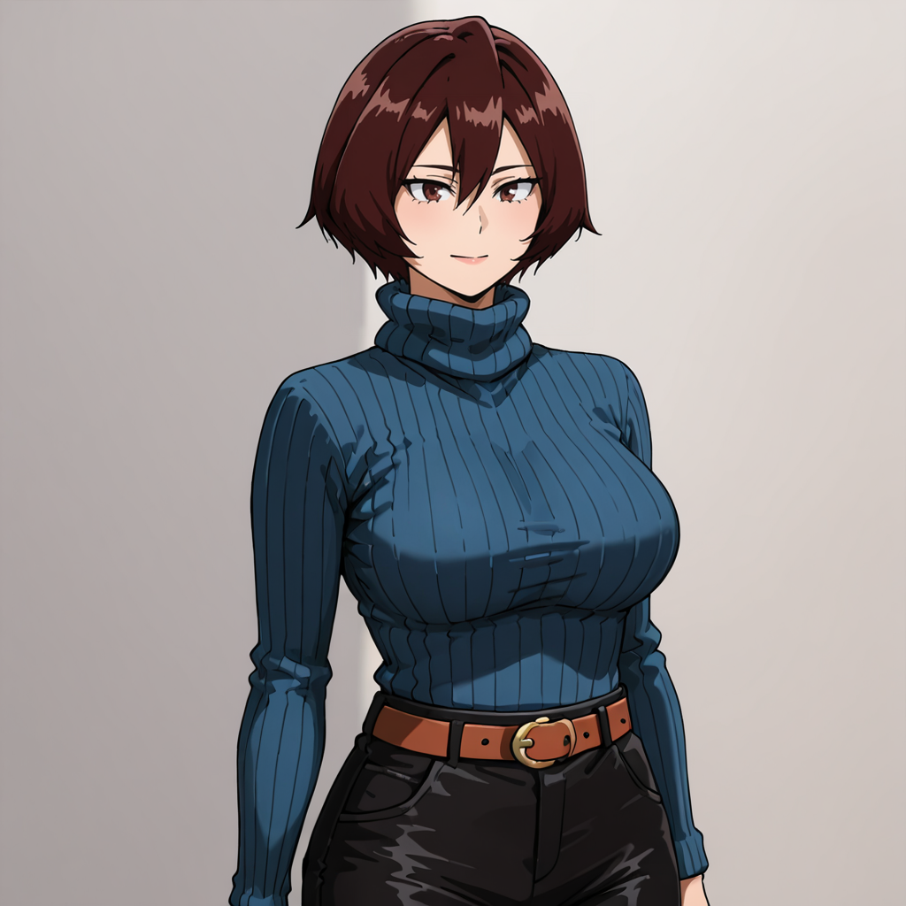 일반 복장 트리거: MandalayNormal, 1girl, 리브 스웨터, 갈색 머리카락, 단발, 터틀넥 스웨터, 갈색 눈, 벨트, 가슴, 파란 스웨터, 눈 사이 머리카락, 검은 바지, 카우보이 샷