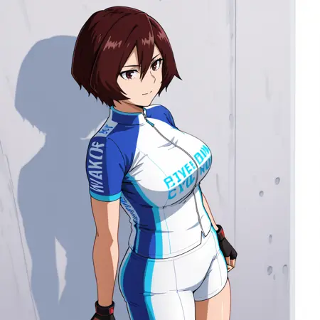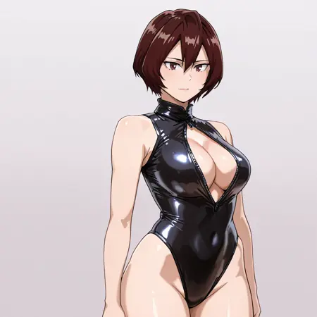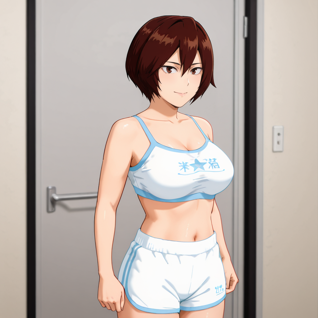 헬멧 없음 트리거: MandalayWithoutHelmet, 1girl, 갈색 머리카락, 단발, 배꼽, 갈색 눈, 복부, 팔 없음, 가슴, 얼굴 무늬, 어깨 노출, 크롭탑, 카우보이 샷