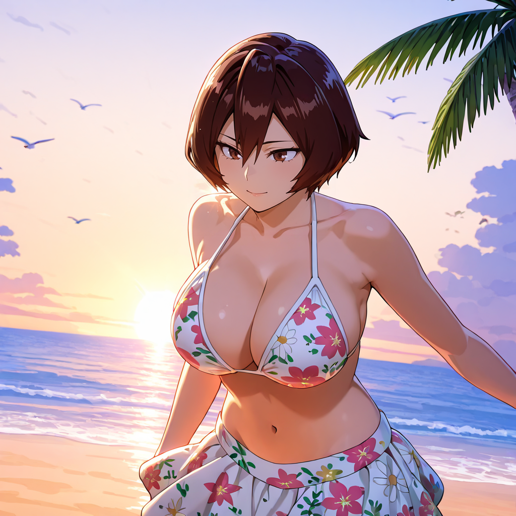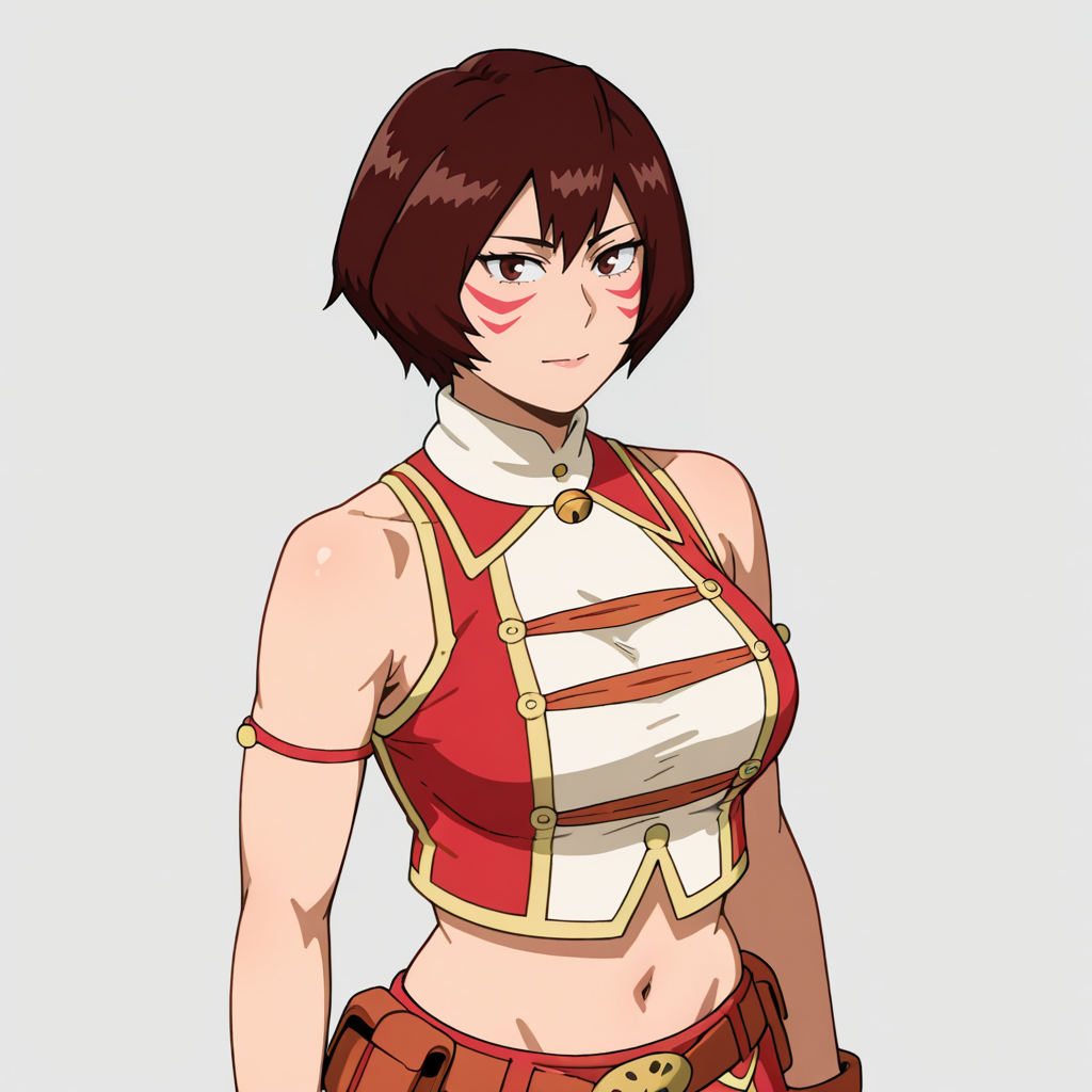 트리거: Mandalay, 갈색 머리카락, 흰 장갑, 1girl, 빨간 치마, 단발, 배꼽, 얼굴 무늬, 복부, 갈색 눈, 머리장식, 팔 없음, 앞머리, 크롭탑, 셔츠, 가슴, 어깨 노출, 카우보이 샷