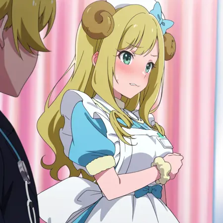AMWKaoruko、金髪、長い髪、リボン、青いリボン、前髪、緑の目、髪を通して見える眉、スヌーチェ、手首のスヌーチェ、髪のリボン、動物の耳、青いリボン、髪飾り、青いスヌーチェ、なびく前髪、角、羊の角、
