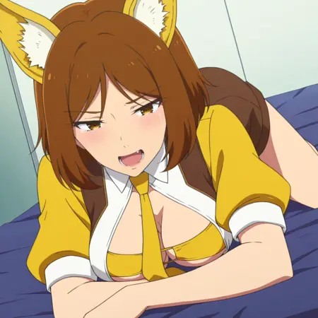 AMWKonKonManager, 갈색 머리, 단발, 갈색 눈, 동물 귀, 넥타이, 노란 리본, 앞머리, 밥컷, 머리카락 사이로 보이는 눈썹, 여우 귀, 노란 넥타이,