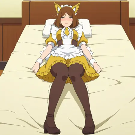앞치마, 메이드, 메이드 앞치마, 드레스, 메이드 헤드기어, enmaided, 프릴, 풍성한 소매, 짧은 소매, 프릴이 달린 앞치마, 흰색 앞치마, 노란 드레스, 팬티스타킹,