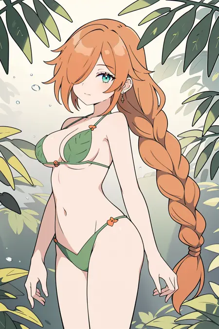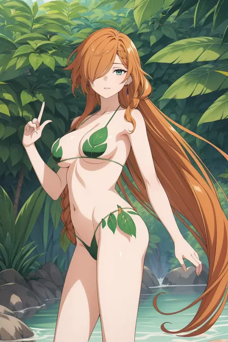 플라메, 1소녀, 앞머리, 땋은 꼬리, 단일 땋은 머리, 갈색 머리, 주황색 머리, 매우 긴 머리, 옆머리, 빨간 귀걸이, 한쪽 눈 위의 머리카락, 녹색 눈, 파란 눈,
