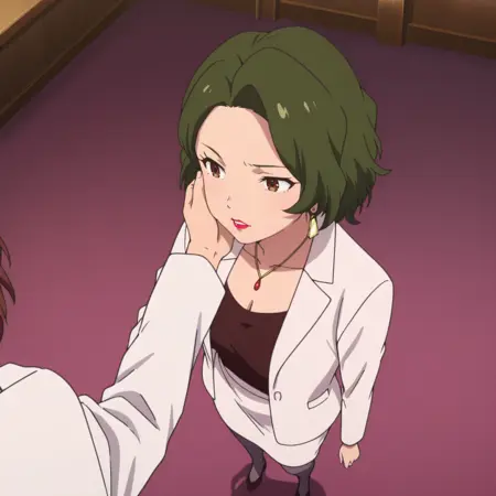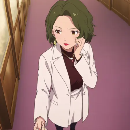 AMWTaira、短い髪、緑の髪、茶色の目、イヤリング、リップスティック、ネックレス、フープイヤリング、赤い唇、まつげ、前髪、パールネックレス、
