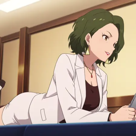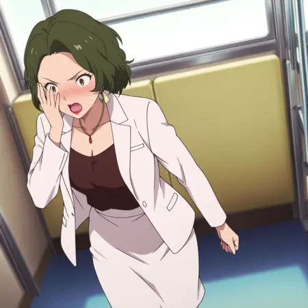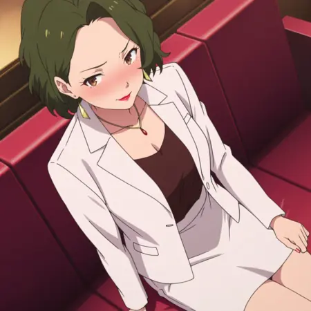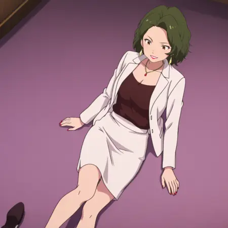 シャツ、胸元、化粧、鎖骨、茶色のシャツ、白いジャケット、開いたジャケット、ペンシルスカート、白いスカート、