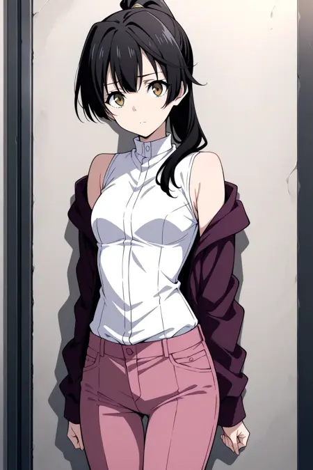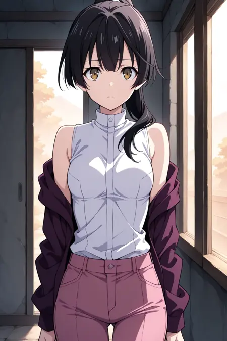 , black hair , long hair , ponytail over shoulder , brown eyes , small breasts , white sleeveless shirt , off shoulder purple jacket , pink pants