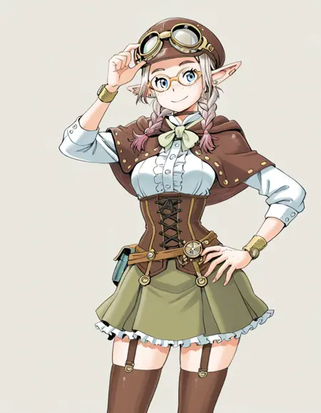 훈련 프롬프트: 1girl, nonoa, nonoachan, 점자, 안경, 두 갈래 땋은 머리, 뾰족한 귀, 엘프, 보석, 귀걸이, 비키니 상의, 재킷, 중간 크기의 가슴, 손가락 없는 장갑, 바지, 파우치, 부츠
