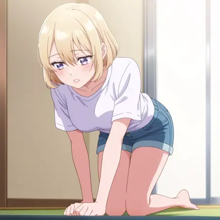 SachiYellowShirt、シャツ、Tシャツ、ショートパンツ、短い袖、黄色のシャツ、服に書かれた文字、鎖骨、短いショートパンツ、