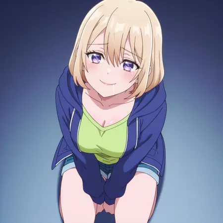 SachiHoodedJacket、フード、フードを下ろした状態、鎖骨、ジャケット、フーディージャケット、長い袖、胸元、シャツ、ショートパンツ、開いた服、緑のシャツ、青いジャケット、デニムショートパンツ、デニム、