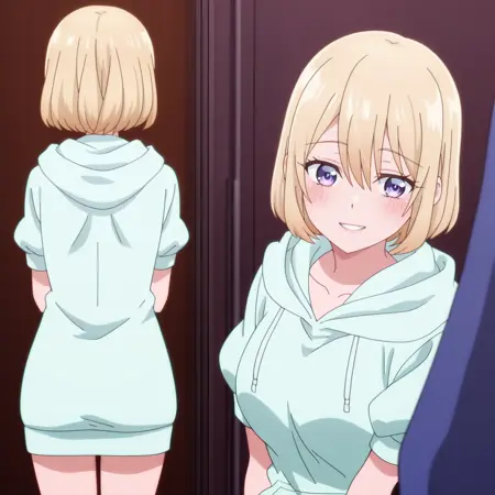 SachiHoodie、フード、フーディー、フードを下ろした状態、青いフーディー、短い袖、鎖骨、ふくらはぎ袖、