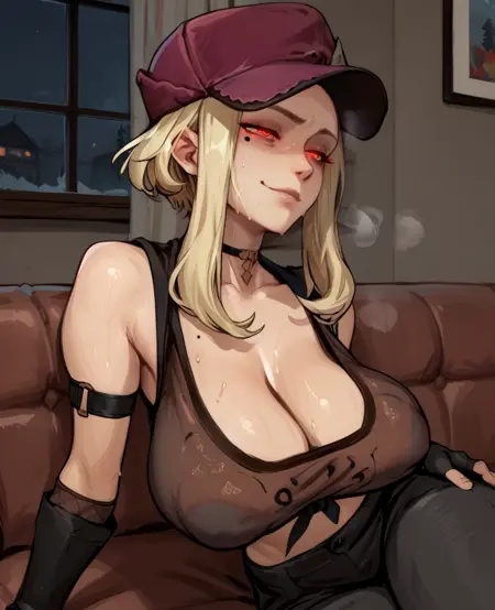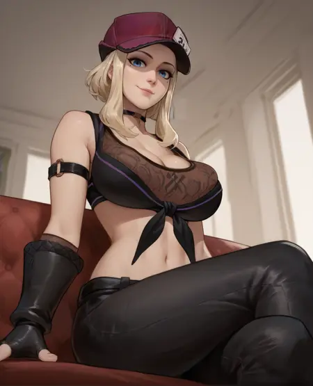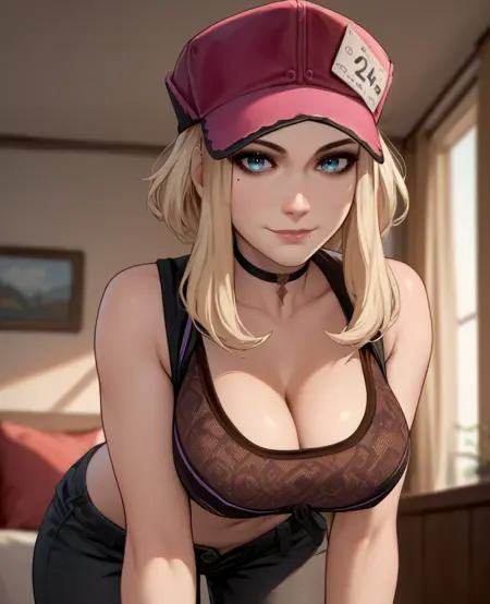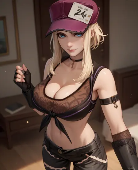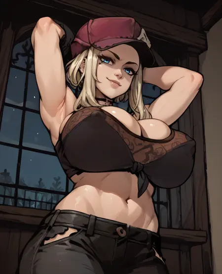 hat, crop top, or dark crop top, bare shoulders, cleavage, fingerless gloves, choker, pants,