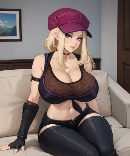 hat, crop top, or dark crop top, bare shoulders, cleavage, fingerless gloves, choker, pants,