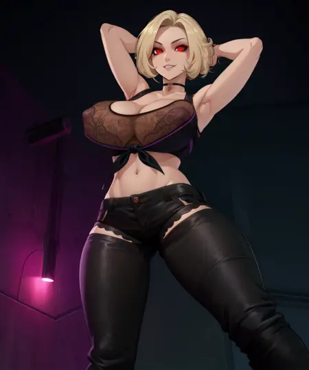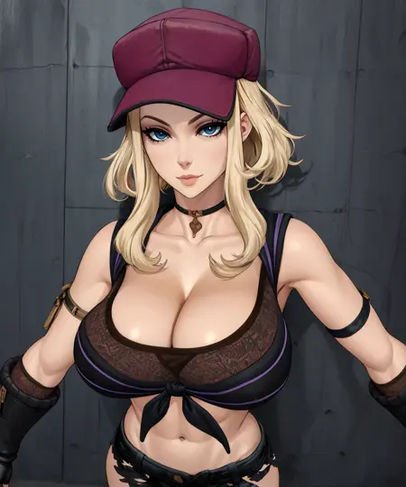 hat, crop top, or dark crop top, bare shoulders, cleavage, fingerless gloves, choker, pants,