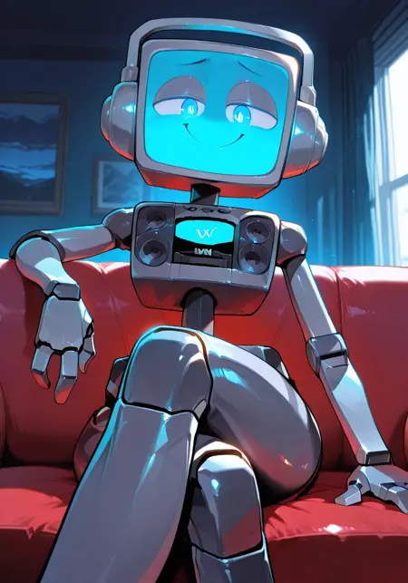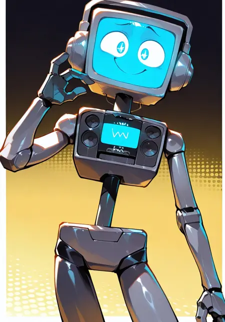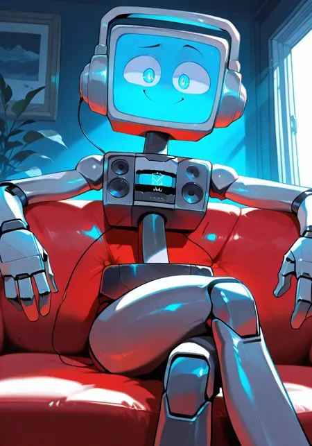 主要标签: anthro, robot, robot male, grey metal skin, tv-head, bluescreen tv-head, headphones, four fingers, speakers on torso, glowing face, slim, eye sclera