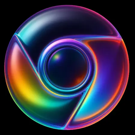 【アイコンの形状を説明】のアイコン、光沢のある半透明なガラス彫刻、液体のような曲線フォーム、鮮やかなレインボーグラデーションの屈折、輪郭に沿った滑らかな色の遷移、抽象的だが認識可能な形状、高光沢仕上げ、光の曲がる反射、シャドウなし、無彩色のマットブラック背景、ミニマリスト、黒い背景に孤立して