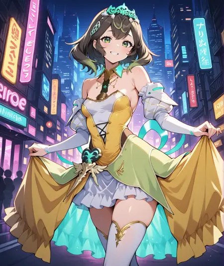 标签:SpheneBase,绿色眼睛,多色头发,棕色头发,绿色头发,中长发,水蓝色发冠,发饰,分离式衣领,项链,珠宝,裸露肩膀,锁骨,小胸,金色镶边,露肩礼服,层叠式礼服,双色礼服,黄色礼服,白色礼服,绿色点缀,水蓝色内衬,无肩带礼服,荷叶边裙摆,不对称裙摆,水蓝色丝带,花卉配饰,可拆卸袖子,蓬松袖子,长袖,白色肘部手套,白色新娘手套,白色过膝袜,黄色高跟鞋,