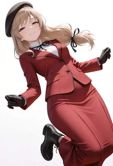 트리거: 1girl, solo, 반쯤 감은 눈, 연한 갈색 머리카락, 낮게 묶인 긴 머리, 머리리본, 갈색 눈, 모자, 베레모, 검은 머리장식, 흰 셔츠, 긴 소매, 높은 칼라, 빨간 재킷 치마 복장, 목 리본, 검은 리본, 긴 치마, 중간 길이 치마, 빨간 치마, 검은 장갑, 검은 신발, 끈 신발