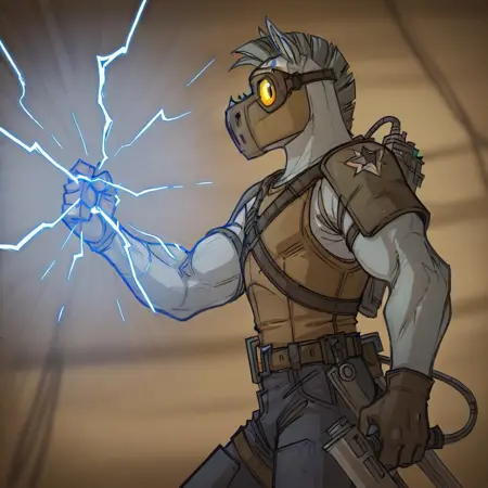 衣装: パンツ, ジャケット, 開いた服, 手袋, 茶色のシャツ, 茶色のジャケット, サスペンダー, ベルト, 茶色の手袋, ブーツ, 茶色の足元, 青いパンツ,