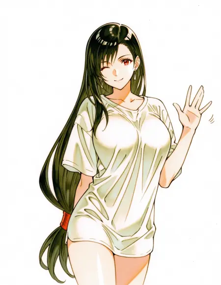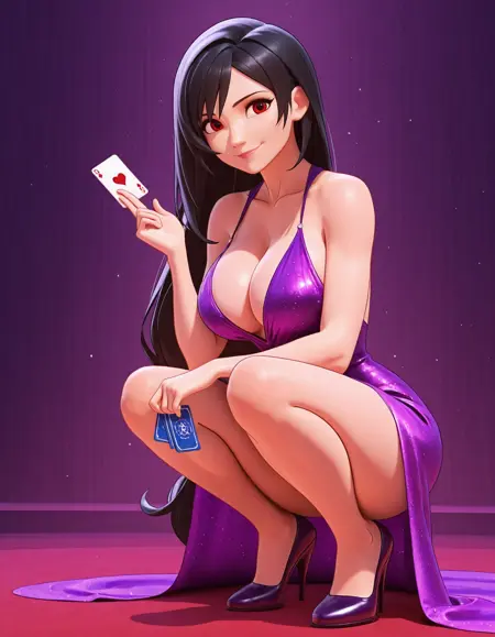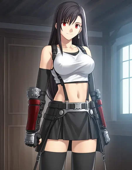 Outfit - long hair, gloves, jewelry, thighs, cowboy shot, earrings, black gloves, elbow gloves, midriff, black thighhighs, fingerless gloves, black skirt, tank top, arm guards, elbow pads