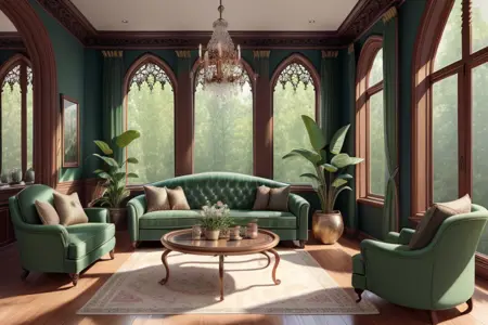 住宅インテリア、屋内、コテージインテリア、ツリーハウスインテリア、暗い、ゴシック、ゴースト、ラグジュアリー、ファンタジー、魔法、ハリー・ポッター、スリザリン、完璧な構図、アワード受賞、Dirk Crabeth、Unreal Engine 5ハイレナード、詳細なマットペイント、ゴシックアート