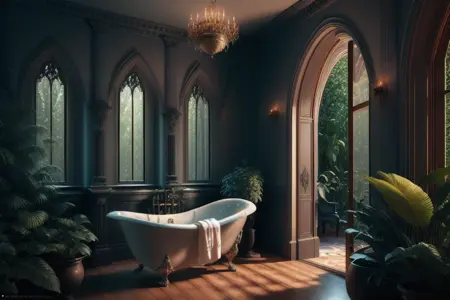 (전문적인 3D 렌더링:1.3), (초현실적:1.3) 마법 같은 인테리어 스타일, 욕실, 목욕실, 식물, 풍경, 창문, 나무, 자연, 욕조, 숲, 거울, 목욕, 수도꼭지, 물, 실내 공간, 실내, 초소형 집 인테리어, 나무 집 인테리어, 어두움, 고티크, 고티크 스타일, 럭셔리, 판타지, 마법, 해리포터, 스네이프, 완벽한 구성, 수상작, CGSociety, ArtStation