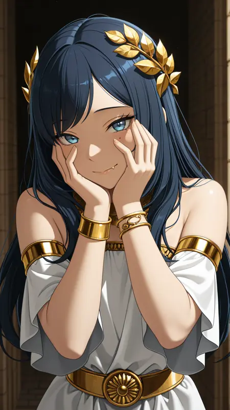 hokuto_mdud, dark blue hair, long hair, side-swept bangs, blue eyes, birthmarks, single fang, large pink hair bow, white collared shirt, pink neck ribbon, light blue top, long sleeves, light blue skirt, long skirt,