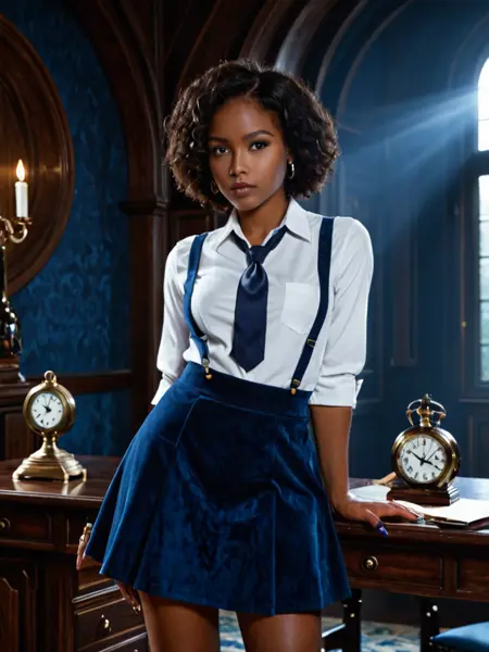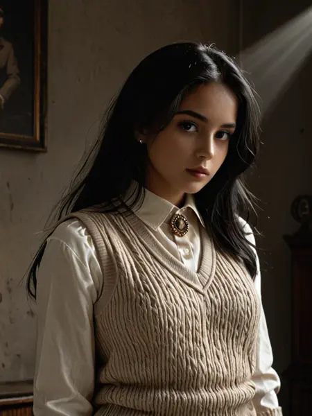 darkacademiaを使用してください。さらに、衣装に特化したプロンプトでガイドできます。Ponyベースの利点:滑らかなレンダリング、表情豊かな顔、柔らかく絵画的な仕上がり。