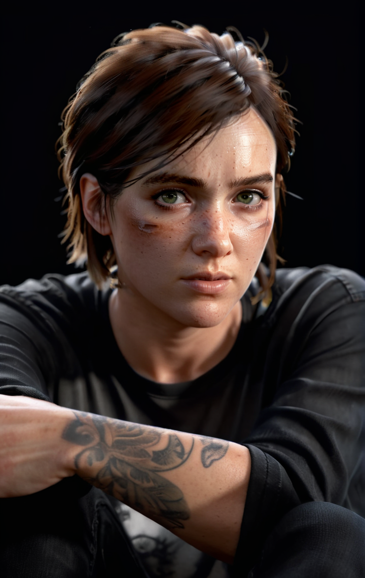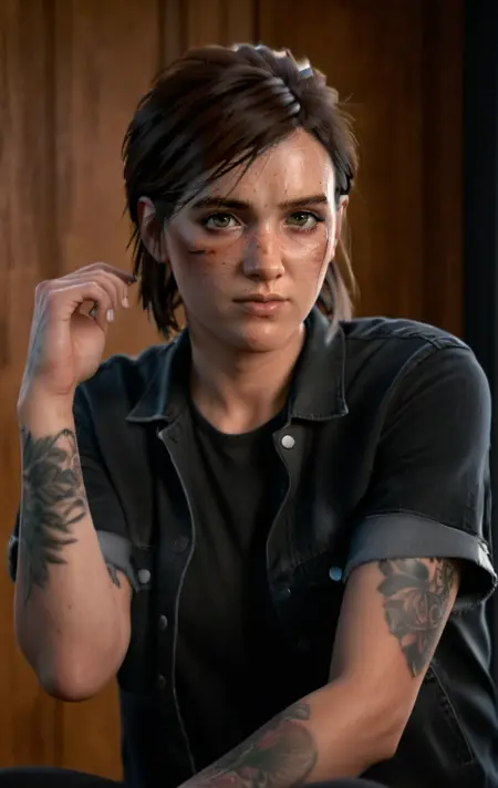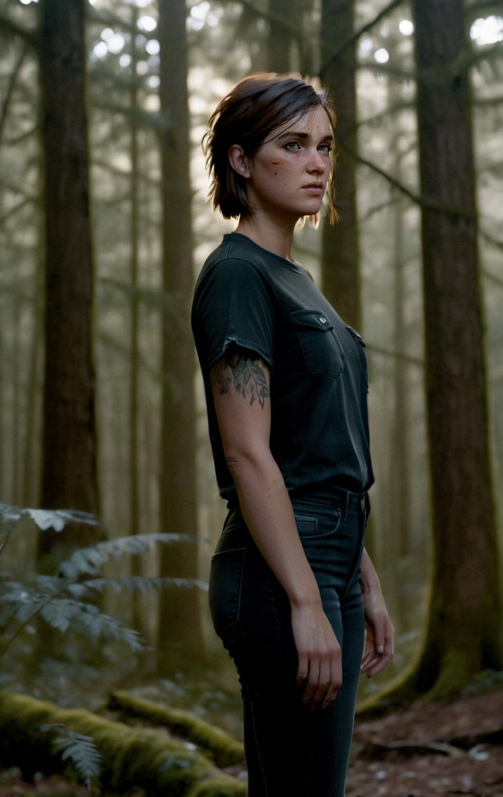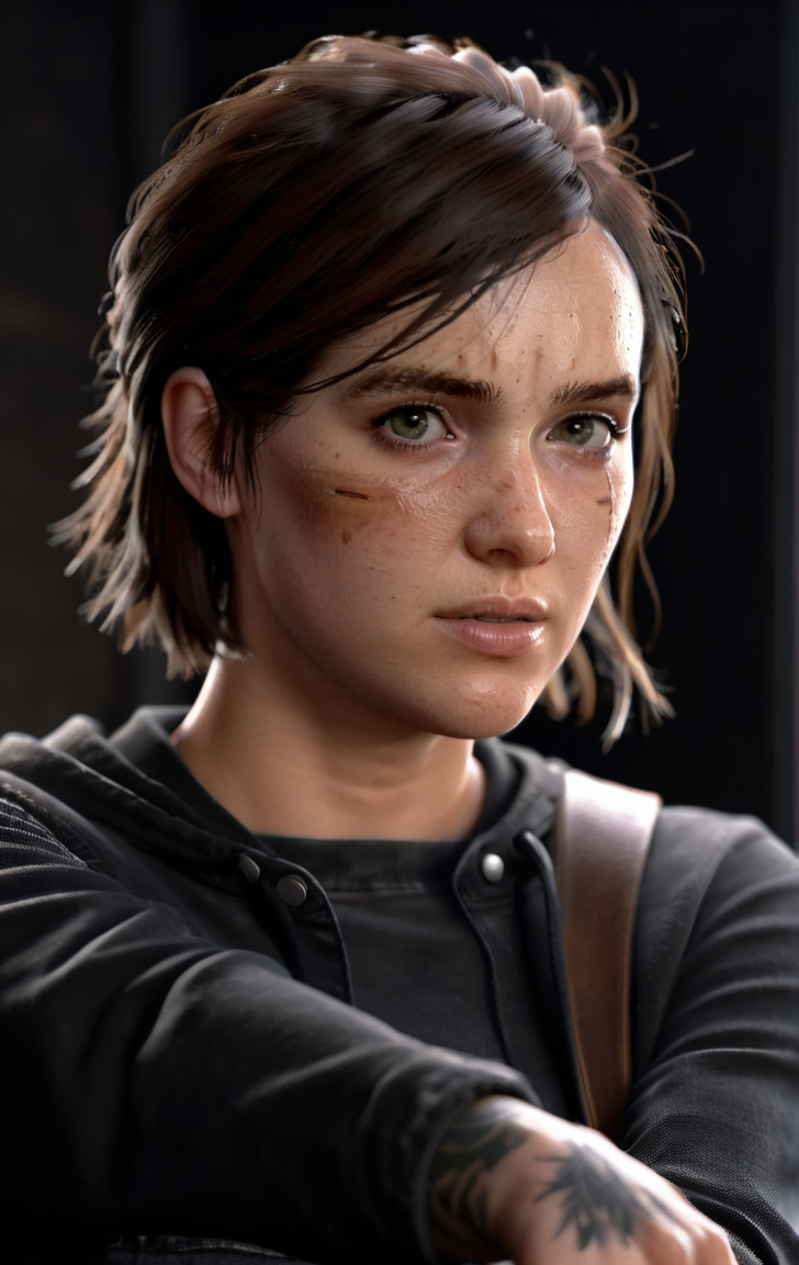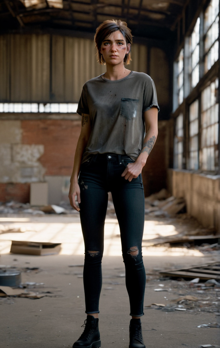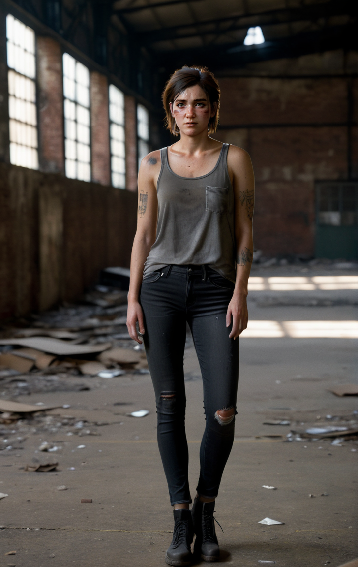 トリガー語は ohxw, Ellie, tattoo on left arm, jeans, backpack