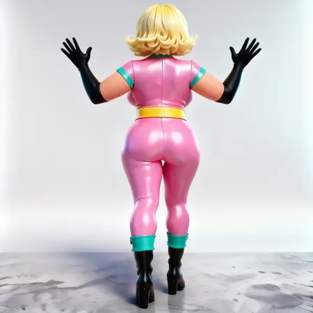 docbblight, doctorblight, docbabblight, 3d character, stylized female character, short wavy blonde hair, white hair streak, smooth layered hairstyle, hair over one eye, expressive green eyes, confident expression, pink glossy outfit, pink jumpsuit, pink lips, curvy body, thick hips, plus-size model, turquoise collar, turquoise earrings, shiny material suit, high collar zipper suit, yellow belt, turquoise accents, black gloves, short sleeves, black high-heel boots, teal boot cuffs, vibrant retro-futuristic style, detailed 3d shading, stylized realism, cinematic lighting, realistic materials, clean render, soft reflections, bright color palette, detailed textures