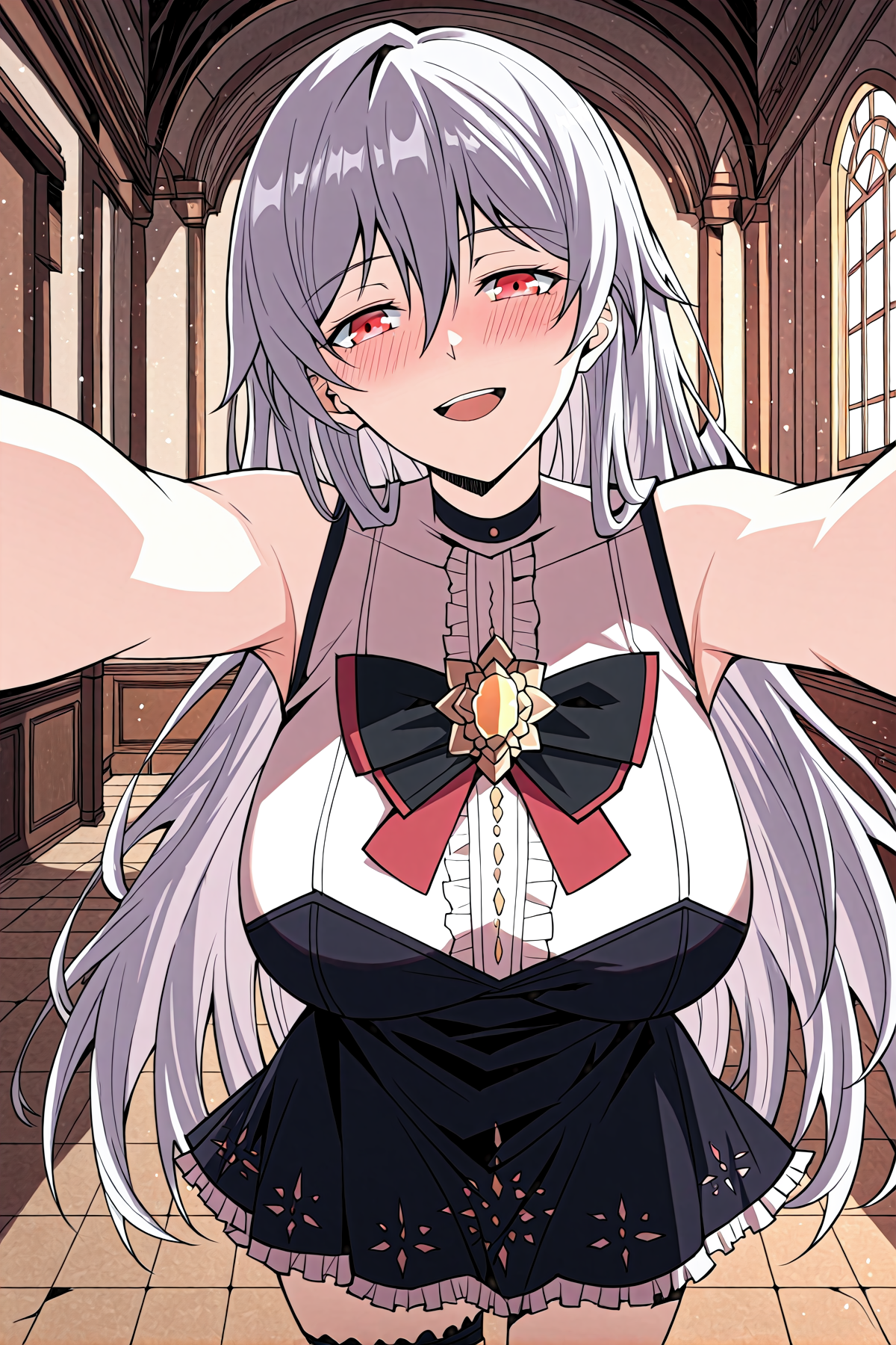 Yeyunfei_outfit, 흰색 블라우스, 검은색 테두리, 어깨가 드러난 블라우스, 가슴 주름, 높은 칼라, 금색 브로치, 검은색 가슴 리본, 검은색 드레스, 어깨가 드러난 드레스, 스트랩 없는 드레스, 플레어 스커트, 흰색 주름진 밑단, 허벅지 게터, 주름진 게터, 검은색 발레 슈즈, 발목 스트랩 신발,