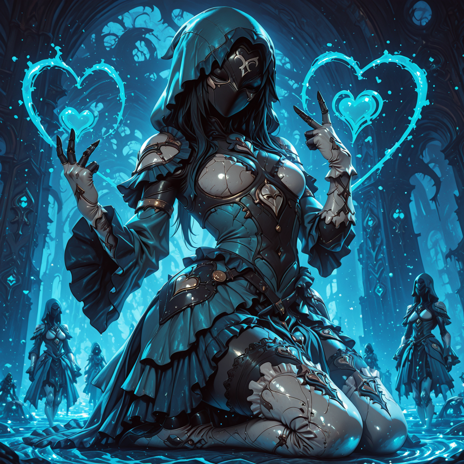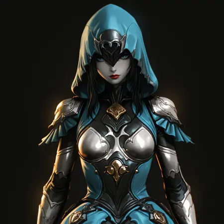 yareli, armor, black skin, blue hood, black mask, blue dress, gold buttons, white paldrons, frilled pauldrons, one sleeve, frilled sleve, small breasts, white breasts, long gloves, white fingerless gloves, blue skirt, frilled skirt, thighhighs, white boots, thigh boots, black soles