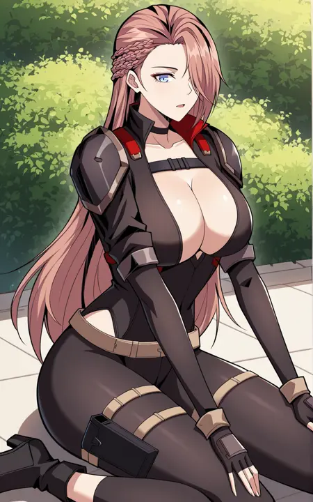 Siyu_outfit2、ブラックのボディスーツ、赤いトリム、ハイカットボディスーツ、高めのカラー、ブラックのチョーカー、ブラックの胸ストラップ、胸元、ロングスリーブ、肩アーマー、腕ストラップ、フィンガーレスグローブ、ベージュのベルト、太ももストラップ、ホルスターストラップ、ブラックの踝ブーツ
