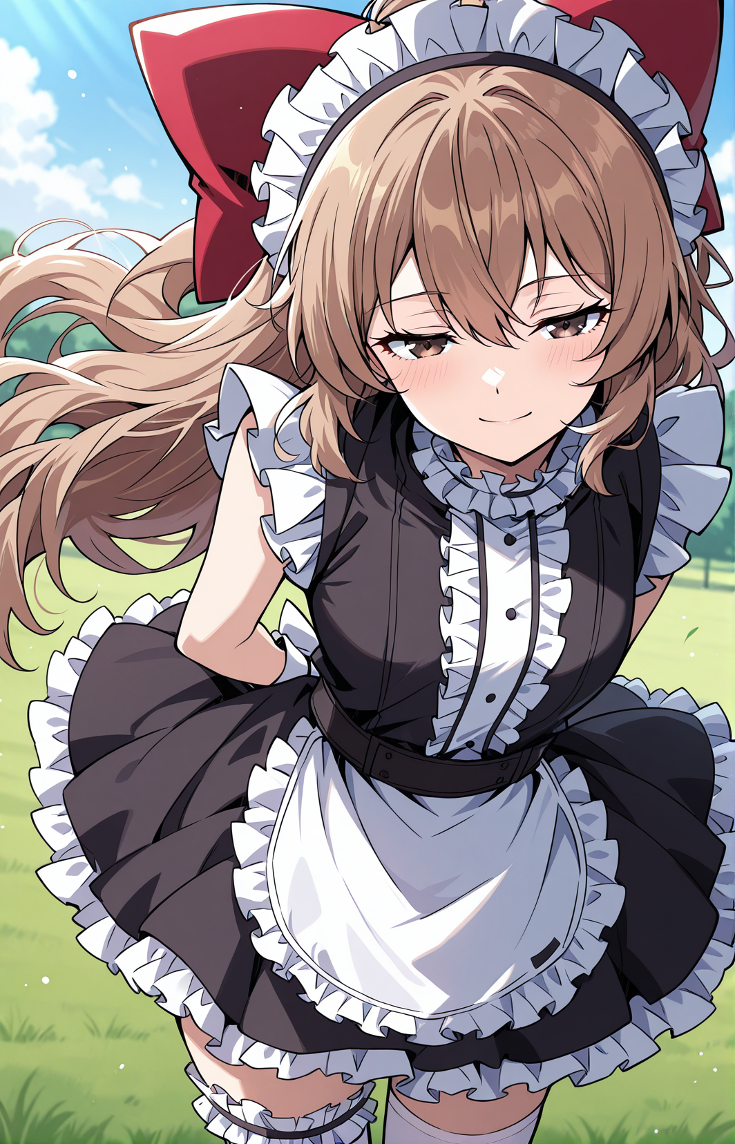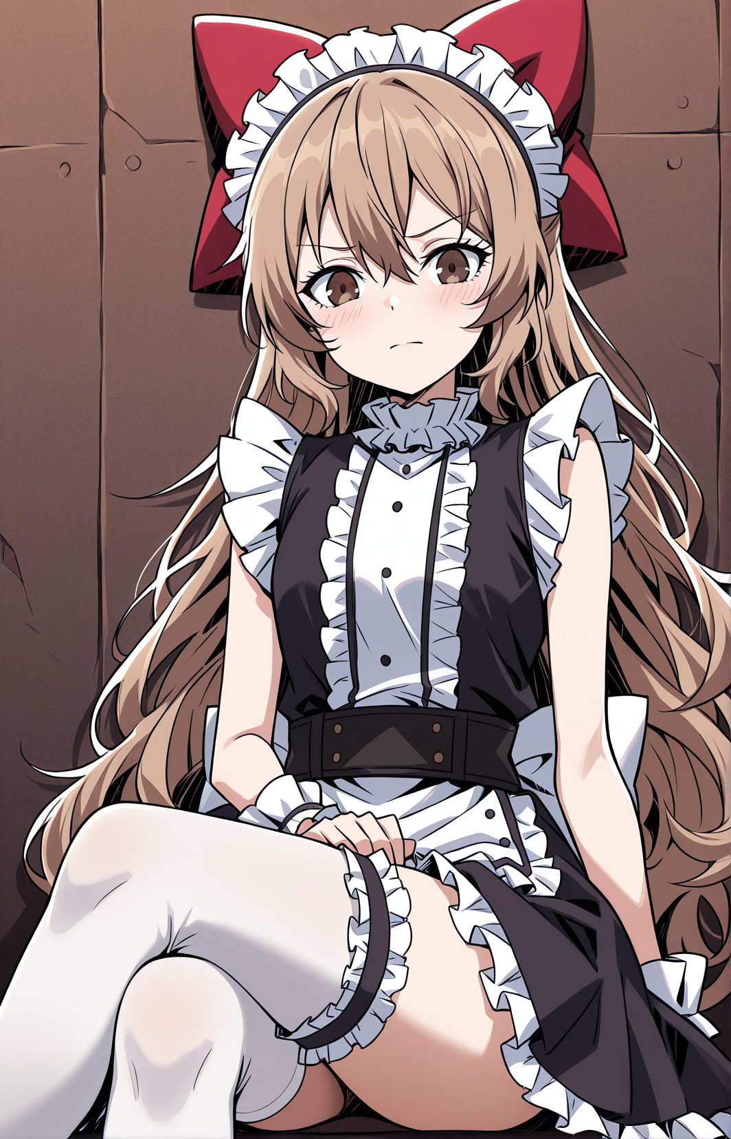 나나, 1소녀, 혼자, 갈색 눈, 연한 갈색 머리카락, 파마 머리카락, 긴 머리카락, 긴 앞머리, 불균형한 앞머리, 눈 사이의 머리카락, 옆머리, 메이드 헤드밴드, 흰색 프릴 헤드밴드, 빨간색 머리 리본, 큰 머리 리본,
