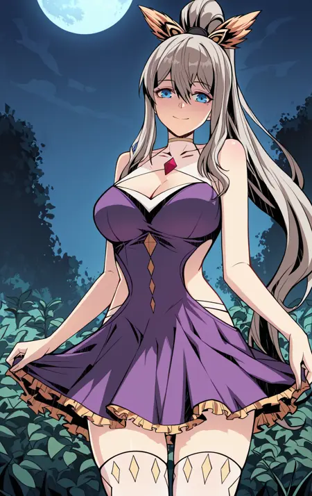 Tiantian、1 girl、ソロ、青い目、アッシュブロンドの髪、長い髪、高いポニーテール、長い前髪、不規則な前髪、目の間の髪、長いサイドロックス、ゴールドの髪飾り、羽の髪飾り、パープルのヘアタイ