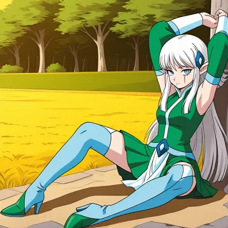 트리거 단어: shimycycle2, 1girl, 엘프, 뾰족한 귀, 시각 장애, 파란 눈, 동공 없음, 눈을 가로지르는 흉터, 흰 머리, 긴 머리, 불규칙한 앞머리, 긴 옆머리, 풍선 같은 분리된 소매, 팔찌, 소매 없는 드레스, 주름진 드레스, 짧은 드레스, 녹색 드레스, 칼라 있는 드레스, 높은 칼라, 골반 커튼, 허리 브로치, 스카프, 머리 장식, 파란 부츠, 허벅지 부츠, 하이힐 부츠,