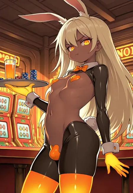 nthtb,1girl,dark skin,small breasts,rabbit ears,blonde hair,long hair,orange eyes,multicolored eyes,glowing eyes,glowing hand,glowing feet,flaming hand,flaming foot,