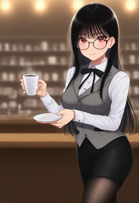 <lora:yumezora-V1>,yumezora, black hair, long hair, red eyes,glasses,medium breasts