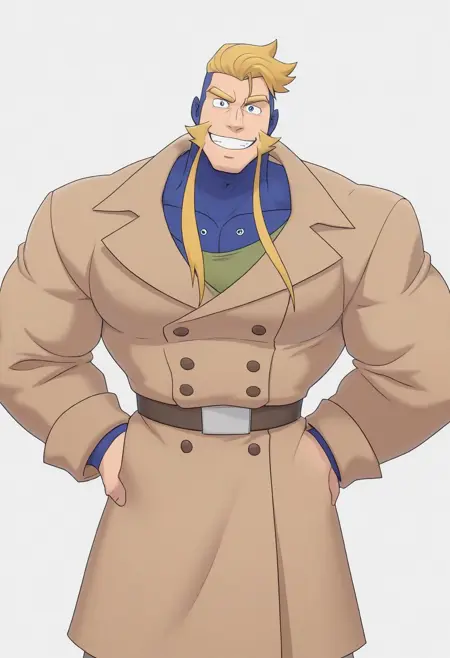 | トレーニングワード | masterpiece, best quality, very aesthetic, source_cartoon, toony, comic art, 90l14th, 1boy, solo, dark blue eyes, male_focus, yellow sideburns long sideburns, muttonchops, blonde_hair, bara, short_hair, mature_male, extremely muscular_male, thick monobrow, manly, tall, long torso, 8-pack abs, obliques, v-taper, v-line iliac furrow, narrow hips, blue tattoos, 40-year old male, rugged features, chiseled face, strong jawline, cybernetic core parts, grin, looking at viewer, neutral lightingコピーしました! brown trenchcoat over green shirtコピーしました! |