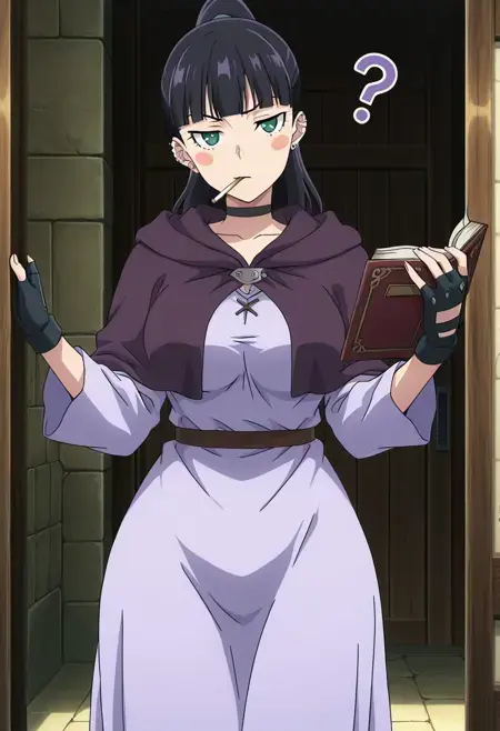 LiselotteTunic, 1girl, solo, long hair, black hair, blunt bangs, ponytail, green eyes, blush stickers, large breasts, curvy, wide hips, ear piercing, black choker, black fingerless gloves, light purple tunic dress, long sleeves, dark purple capelet, high heels, black boots,