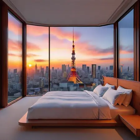 city, cityscape, building, window, t0ky0_ssr, sleeping, pillow, tokyo tower, cloud, blanket, sunset, skyscraper