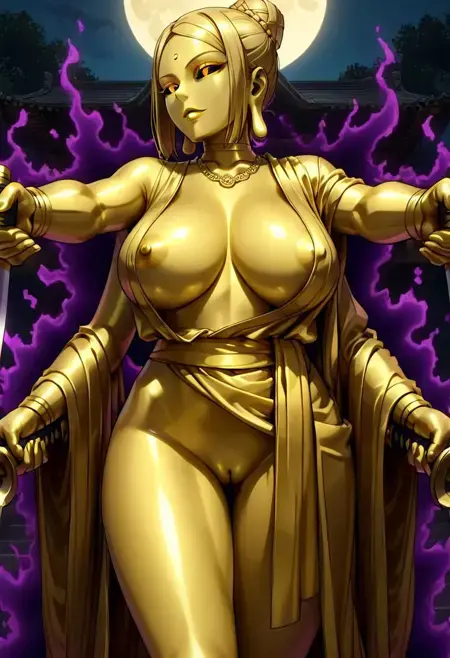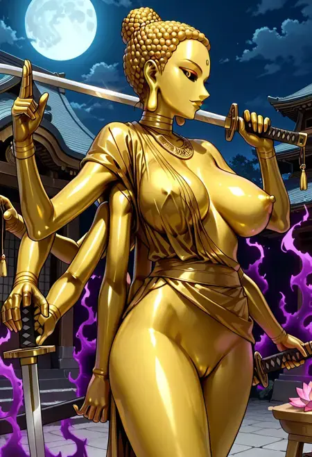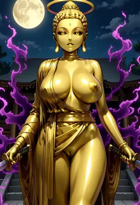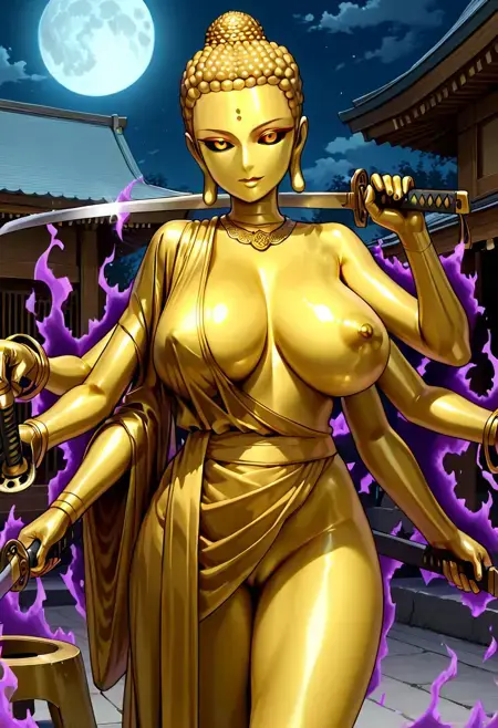 DaibutsuKannonMultiarm, 1girl, solo, short hair, golden hair, hair bun, black sclera, bindi forehead mark, gold, golden eyes, black pupils, golden lips, collarbone, single bare shoulder, long earlobes, huge breasts, dark golden areolae, breasts apart, no bra, one breast out, golden nipples, one covered nipple, golden skin, colored skin, shiny skin, smoothy skin, jewelry, ((golden robe, golden sash)), wide long sleeves, golden bracelet, golden necklace, fingernails, thick thighs, bare legs, no panties, golden pussy, wide hips, barefoot, toenails, glowing, halo, dark aura, lotus stool, ((6 arms at back)), weapon, sword, ((holding swords)), uncensored,