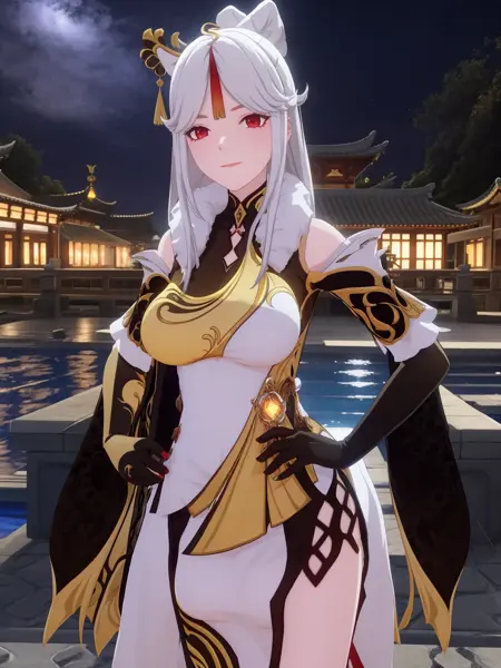 YSningguang, 1girl, solo, red eyes, long hair, hair ornament, looking at viewer, elbow gloves, dress, chinese clothes, white hair,bangs, tassel, hairpin, claw ring, breasts, china dress, parted bangs,sidelocks,hair stick, vision \(genshin impact\),cityscape, night, poolside, cowboy shot,