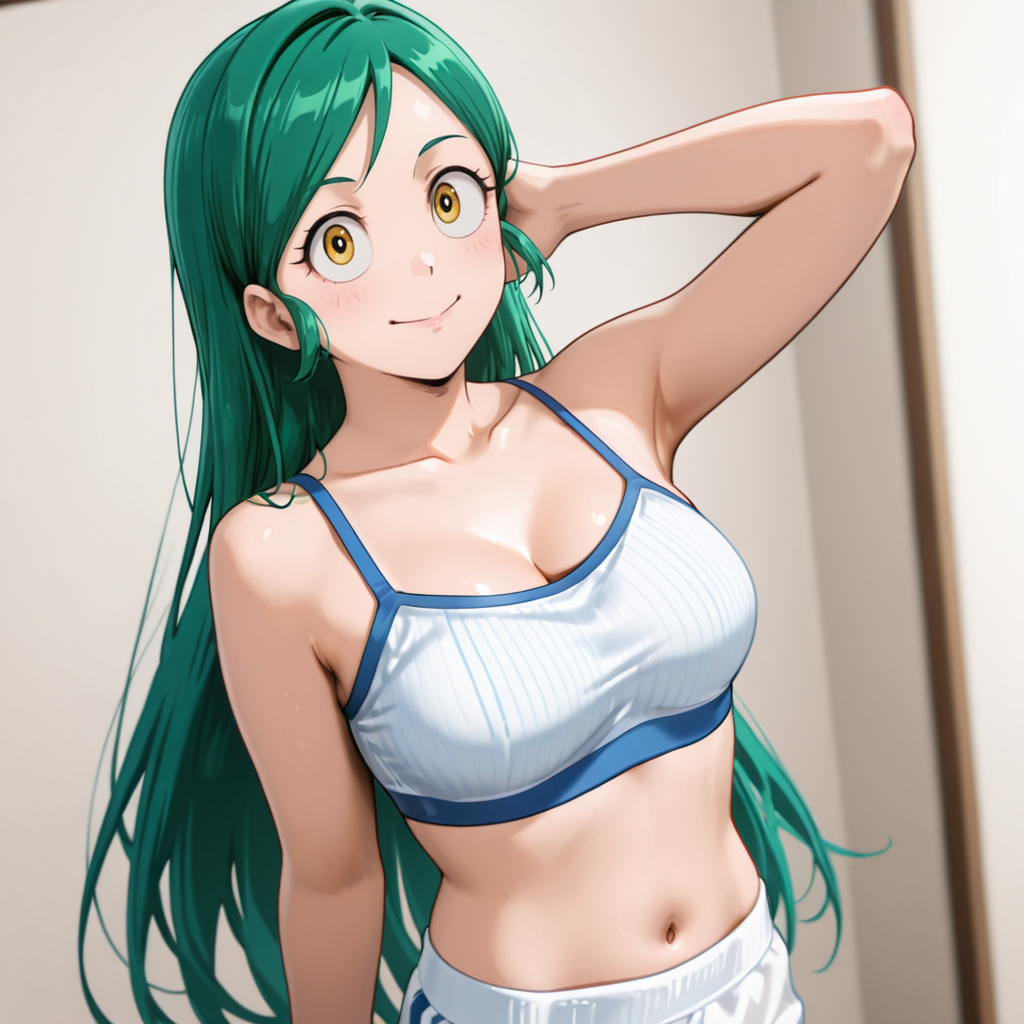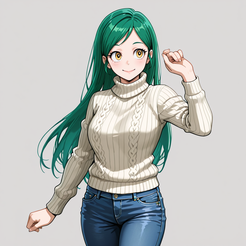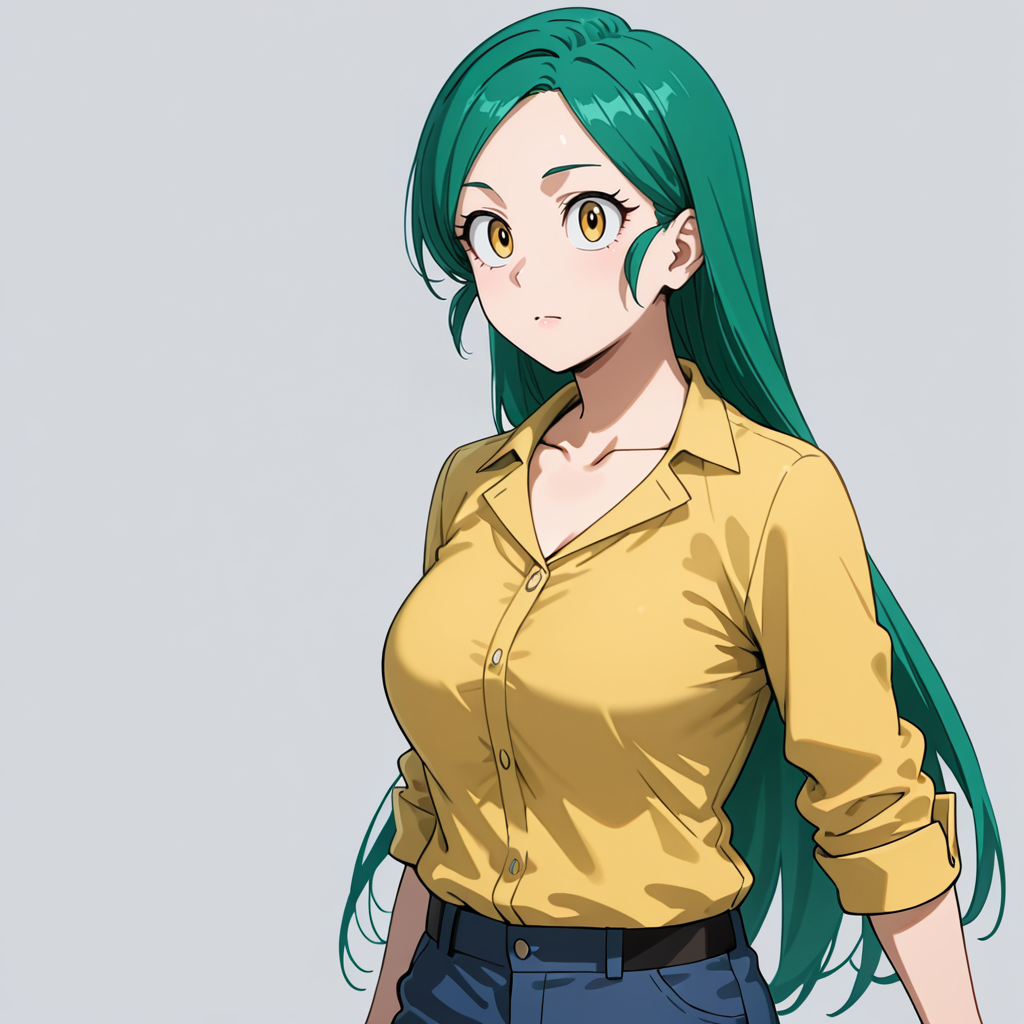 셔츠 포함 트리거: TomokoMHAShirt, 1girl, 긴 머리, 녹색 머리, 노란 눈, 연한 노란 셔츠, 바지, 중간 크기 가슴, 목뼈, 소매 말아 올림, 긴 소매, 카우보이 샷