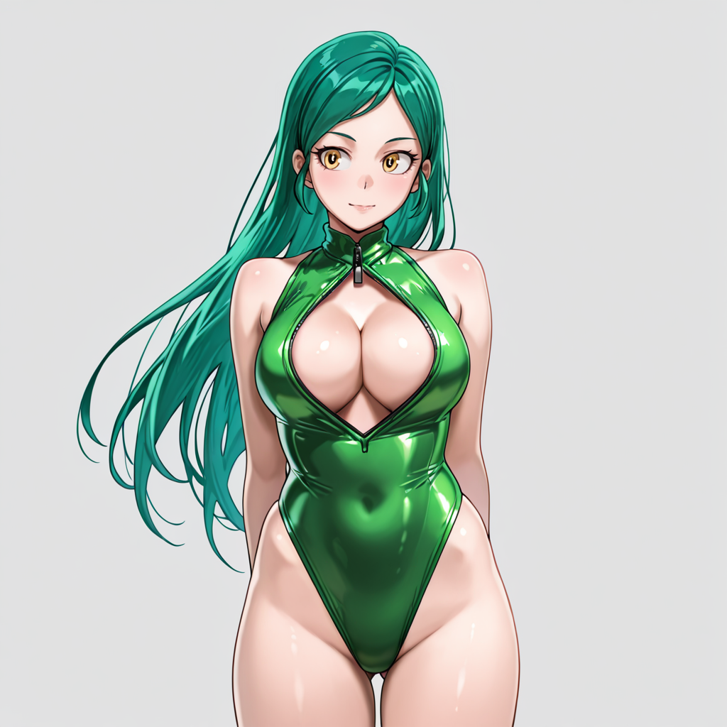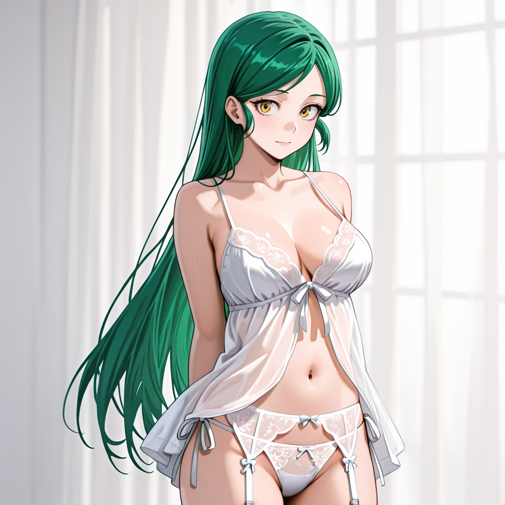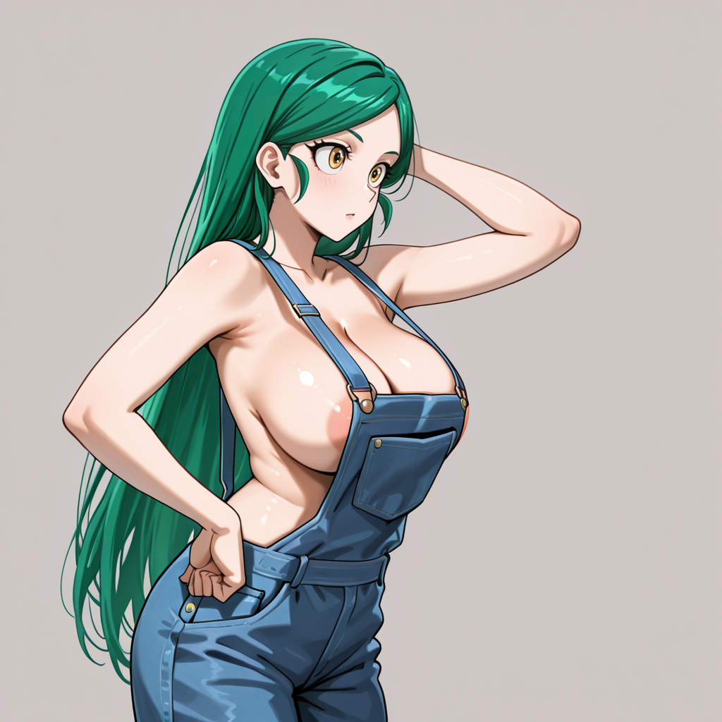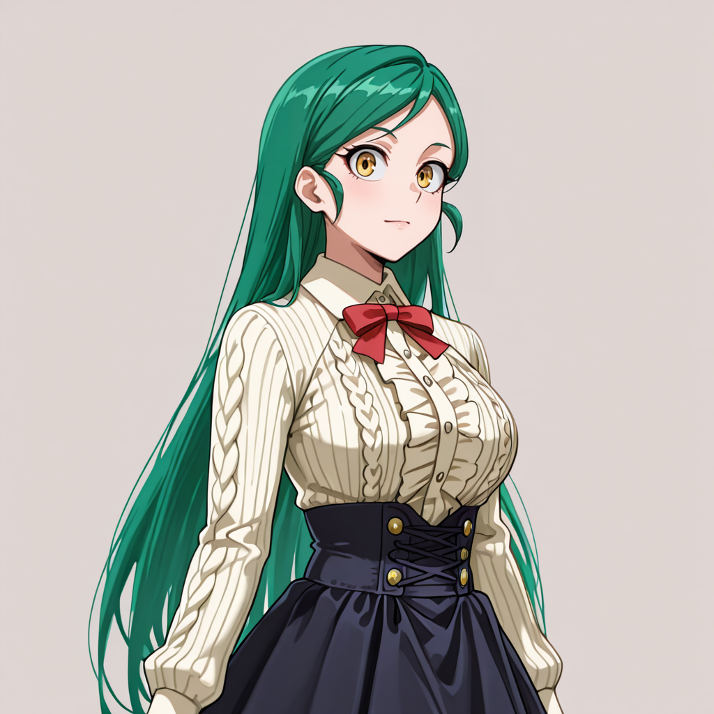 셔츠 포함 트리거: TomokoMHAShirt, 1girl, 긴 머리, 녹색 머리, 노란 눈, 연한 노란 셔츠, 바지, 중간 크기 가슴, 목뼈, 소매 말아 올림, 긴 소매, 카우보이 샷